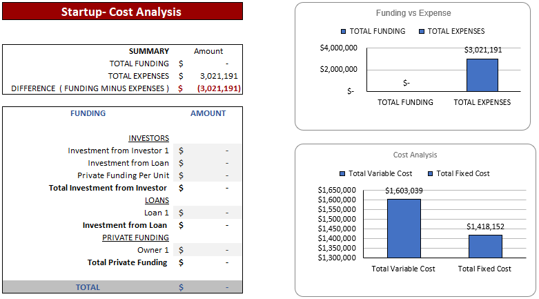 A start-up summary tab includes the total cost incurred at the start of business and capital expenditure, how much cash injected by the company so far, and the number of months the amount of investment required is calculated.