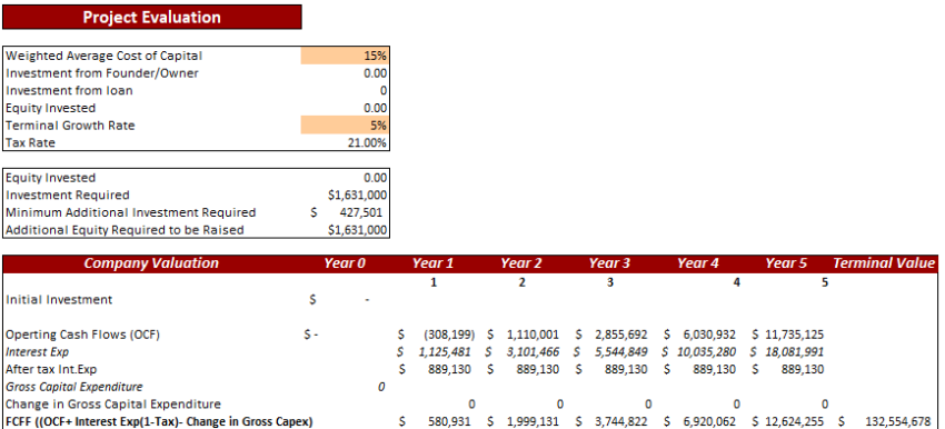 The terminal growth rate is the rate that users foresee a business may earn after a five-year forecast. This rate is hardcoded by the user, keeping in view a specific industry, country, and region in mind. The sole purpose of the project valuation sheet is to use the DCF model to discount back all future expected cash flows of the firm at a discount rate or WACC (set by user). Then determine the NPV/ free cash flows to the firm (both equity and debt holders) so that investors can see if the project has positive or negative net cash flows. Next, the debt/ loan amount is minus to arrive at free cash flows to equity holders. Finally, IRR equals IRR function to see if the project’s IRR is greater than or less than the discount rate.