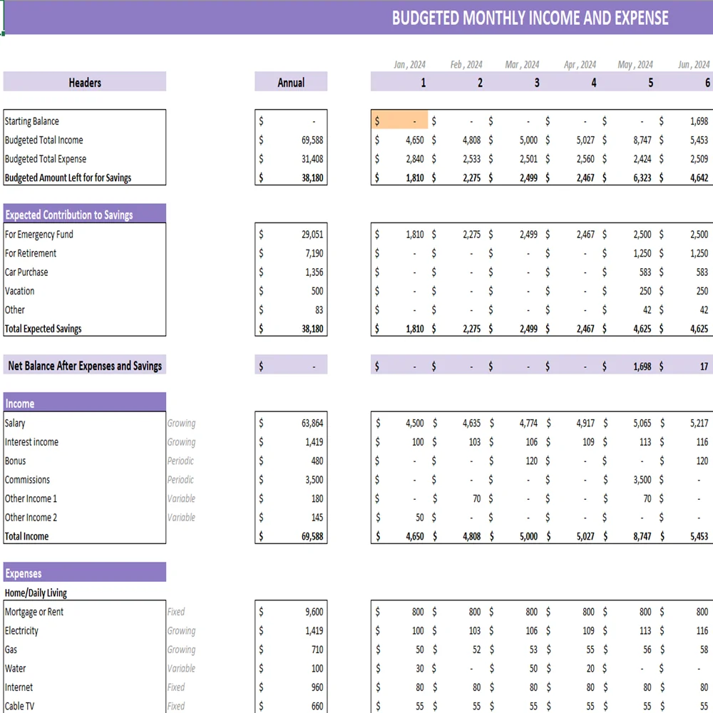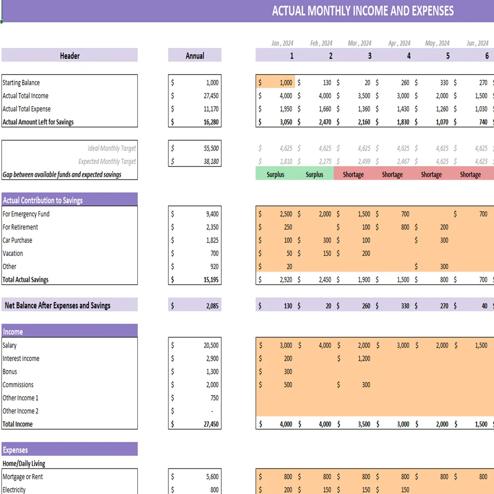 This section helps you establish a budget by detailing your expected income and planned expenses for each category. It forms the foundation of your savings plan. You will have a proper monthly budget spreadsheet.