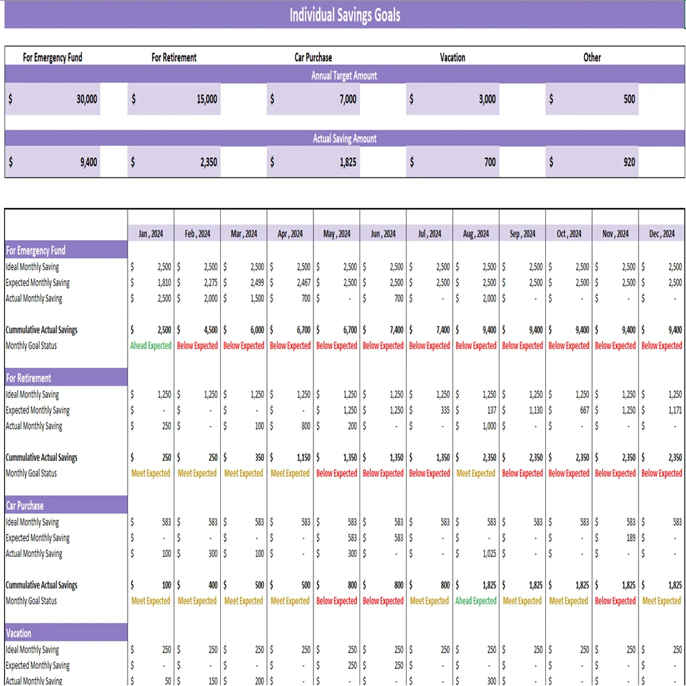 This section allows you to set and monitor individual savings goals. You can specify the goal, target amount, and target date, and the template will help you track your progress toward achieving each goal.