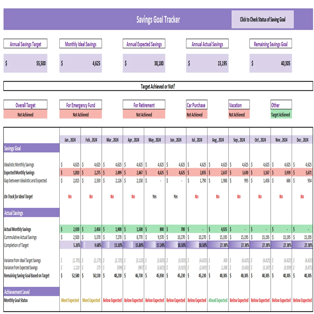 Saving money is pivotal for achieving financial freedom and reaching your long-term goals. Whether you’re saving for a vacation, a new car, a down payment on a house, or simply to build an emergency fund, having a savings plan and a savings spreadsheet in place is crucial. To help you manage your monthly expenses and spending habits effectively, we’ve created the Savings Goal Tracker Excel Template. This article will guide you through setting up and using this perfect tool to take control of your finances and navigate towards your money goals.