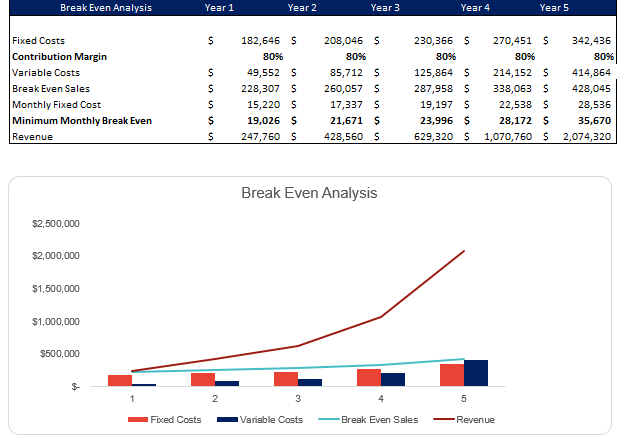 The break-even analysis tab is useful to determine the number of units and revenue required to achieve break even.