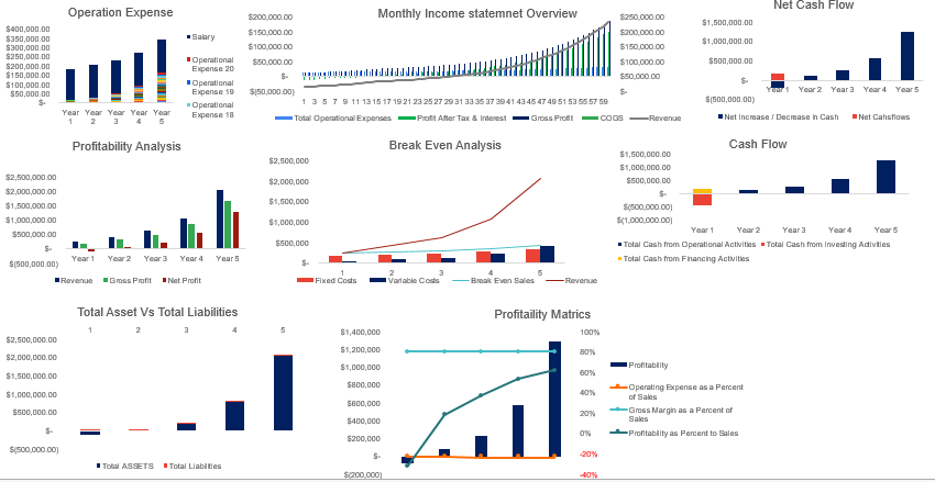 In the Dashboard tab: Various graphs present the revenues, cash analysis, break-even analysis, sensitivity, assets vs liabilities, startup summary etc.