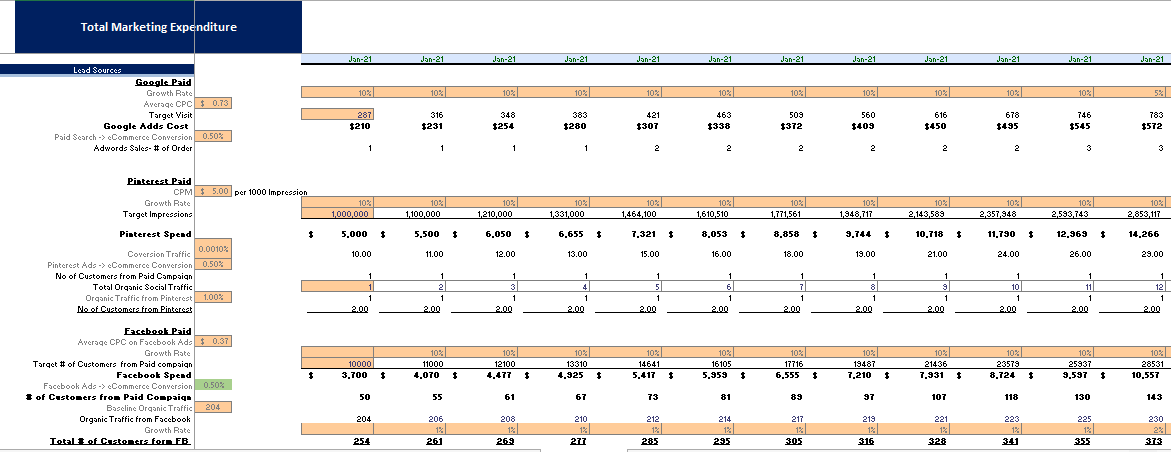 The template contains a marketing budget sheet which evaluates all possible marketing channels. The Sheet tell you how many expected customers you will have with different channels. For example, spending $2000 on Facebook marketing will bring 1,000 active customers. It is advisable to enter the conversion rates from the internet for more accuracy.