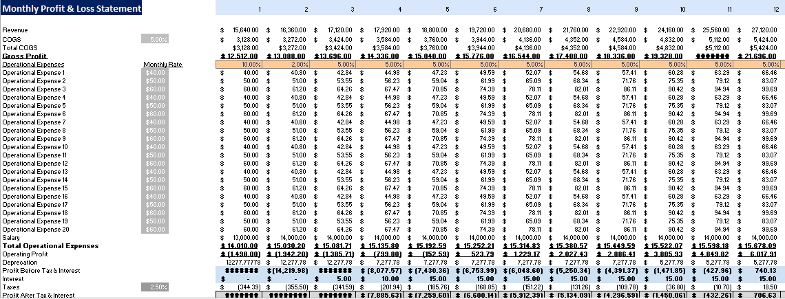 Calculations: The revenues are calculated based on the product or services sold, promotion, pricing, promotions, and marketing campaign, and deducting the business variable and fixed costs the operating profit is resulting. Based on the assets financed and the gearing of the financing, the interest and depreciation calculation is done. With the help of working capital assumptions, we have measured the impact on business cycles. The PnL Monthly tab has aggregation with relevant statements: profit and loss, balance sheet, and cash flow every month.
