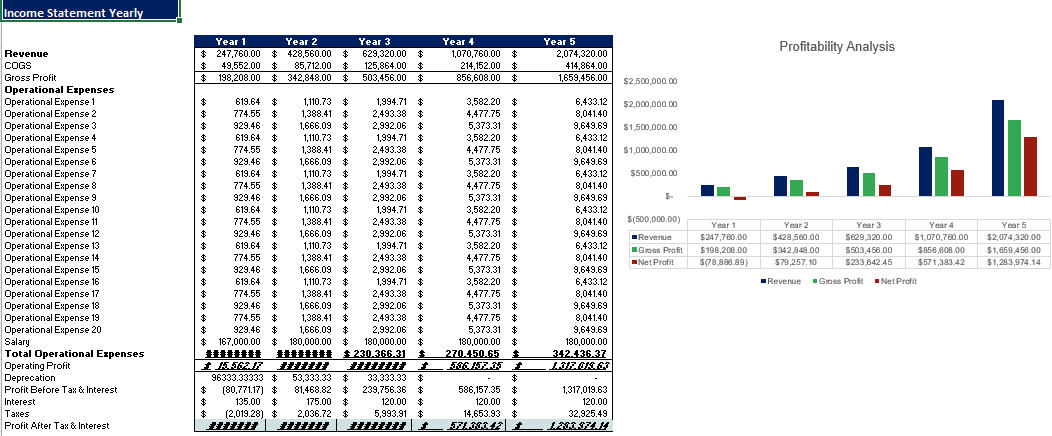 Furthermore, the Yearly Income Statement gives you complete insights into revenue and general & administrative expenses. The Yearly Income Statement also contains several graphs, assumptions, ratios, margins, net profit, earnings, cost of services, and profit after tax.