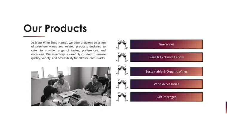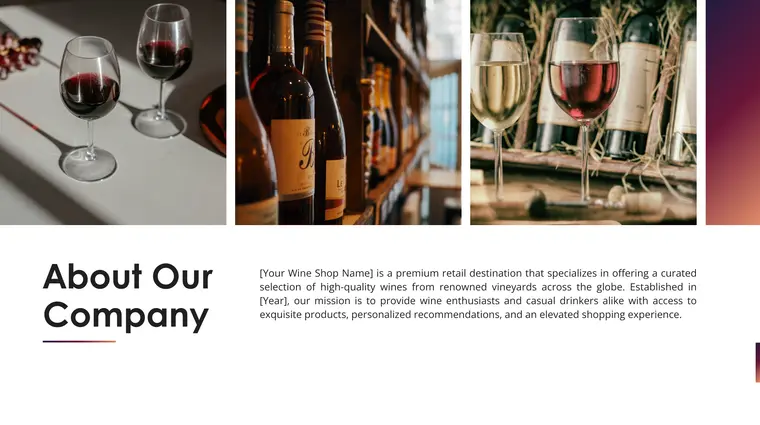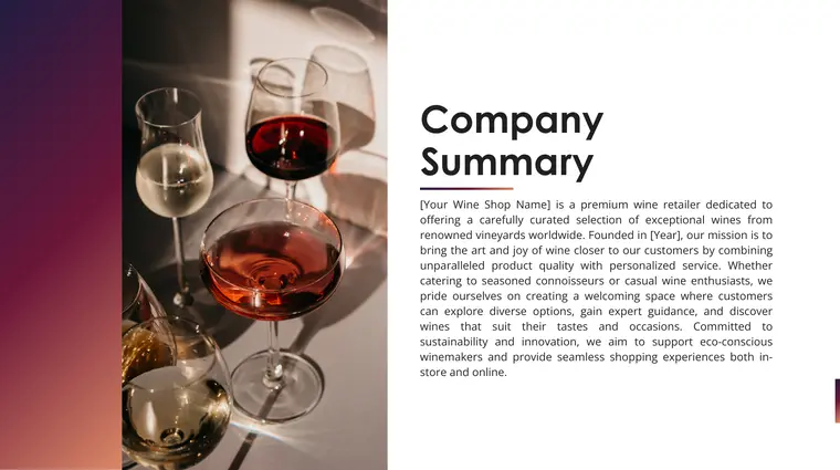 company summary provides a snapshot of what makes your wine shop unique. It highlights your vision, values, and what sets you apart in the competitive landscape of the wine retail industry.