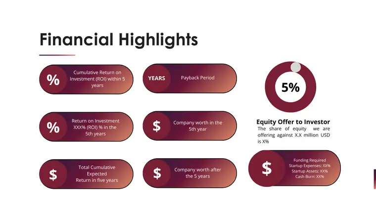 - Highlight your financial projections and growth potential, helping investors visualize the return on their investment.